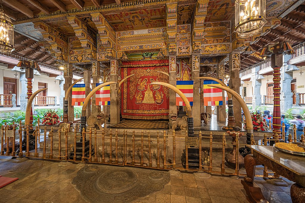 Der Heiligenschrein beherbergt das sakrale Zahnrelikt in der Stadt Kandy in der Nähe des ehemaligen königlichen Palastes,der nördlich vom Tempel liegt und die Waldreserve wird „Udawaththa Kelaya“ zum Osten genannt. Der berühmte Kandy See , auch bekannt als „Kiri Muhuda“zum Süden und “Natha & Paththini Devala” zum Westen. Der Tempel ist verziert mit aufwändigen Schnitzereien aus Gold, Silber, Bronze und Elfenbein.
